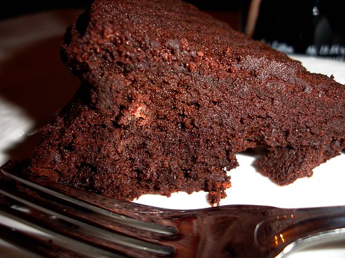 Well, this is Wine Blogging Wednesday but it almost seems like the focus is on the cake, more than the wine! Not really, I guess, but I did get caught up in the cake. Clotilde is the host this month and her challenge was for us to pick a wine that would pair well with a cake recipe posted on her site. Well, I glanced a bit at that recipe but decided instead that this was a really good excuse for me to try one of the many recipes I’ve been drooling over in Fran Bigelow’s cookbook, Pure Chocolate. It was the same idea – a dense, chocolaty cake – but the one I chose had a bit of an advantage. There was wine in the recipe!