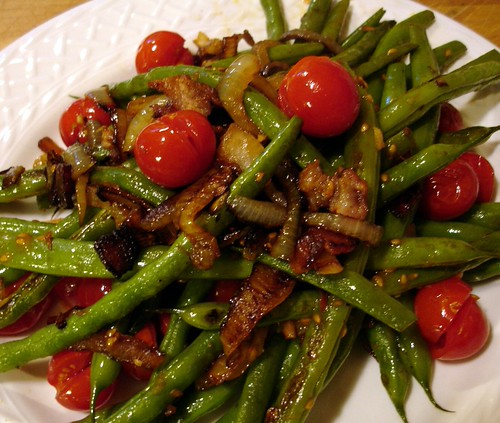 Cut one piece of thick bacon into 1/2" pieces; sauté over medium heat until about 50% cooked. Add 1/2 onion cut into 1/4" slices and a few pieces of chili pepper, if desired. Continue sautéing until the onion is tender. Add 3/4 to 1 pound fresh green beans, tips removed and one or two cloves of minced garlic. Cover and stir occasionally for about 8 minutes, just until green beans are tender but still have bite. Turn off the heat and add a handful of cherry tomatoes that have been slightly crushed or partially sliced at the top. (This releases some of the juice and also makes them easier to eat.) Cover and let sit for about 1 minute – just until the tomatoes area warmed through.