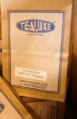 So on Friday, when this rather nondescript box arrived on my doorstep, I was very excited! This box is from my all-time favorite tea purveyor, Tealuxe. Years ago I stumbled across their first shop in Harvard Square. (Perfect place for a perfect tea shop, don’t you think?) It was cold and damp outside but I entered the shop and was enveloped by warmth, the underlying smell of bulk teas and the friendliness of the teatenders. They have another location in Boston and, according to the website, one in Providence, Rhode Island. A word of warning: Before visiting any store outside of the Boston area, call and make sure they are actually still in business. M and I once spend about 1/2 a day in Manhattan trying to track down one of their stores. It turned out it had closed some time prior but I hadn’t checked the website or called to make sure they were still there. It seems they’ve had a hard time surviving outside of Boston, as this was actually their second Manhattan stored that hadn’t been able to make a go of it.