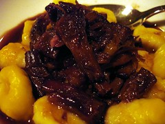 We asked for the next two courses to be served at the same time. We had ordered Braised Oxtail with Gnocchi, and Mussels and Winter Squash Risotto. The mussels were plump and flavorful treasures hidden in the creamy risotto. M and I talked about how we both prefer our risotto more on the creamy side instead of the "too al dente" side and this risotto was exactly what defines perfect. The one disappointment, if you can call it that, is that the squash wasn’t really present. I mean you could definitely see it but it didn’t seem to add much in terms of flavor. Having made a similar risotto myself, I wasn’t really surprised as I’d had the same experience. I guess it probably adds a background note but just isn’t as assertive as you might like. Still, the overall taste of this dish was lovely and again sort of comforting.