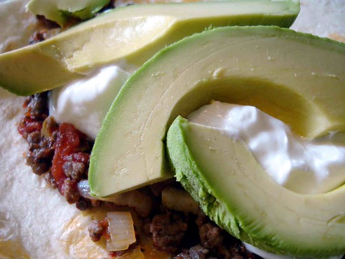 Microwave an enchilada size tortilla, covered with a damp papertowel, for 30 – 40 seconds. Remove the paper towel, spoon on some of the meat, add some sour cream (even fat-free will be fine), and then top with sliced avocado. Fold your tortilla into a little package (bottom up, then roll from left to right). Close your eyes, take a bite and feel the warmth spread out to your limbs. The meat is even better on days 2 – 4!