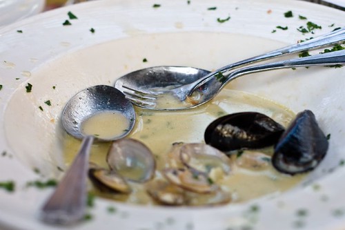 The bruschetta was heavenly as simple food often is. Just toasted country bread, big slices of the tomato, lots of fragrant olive oil with a nice sprinkling of salt and a little basil. Simple and satisfying. The mussels and clams followed the same idea – just local, fresh shellfish, steamed in broth until they opened. Popping the sea-fresh morsels in our mouths and dunking more of the sturdy bread into the broth was a very pleasant way to spend the early evening. Add to that the rich seafood risotto – soft and creamy, with a generous drizzle of that same fruity olive oil and there’s really not much more to ask for.
